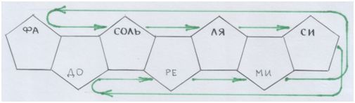 А теперь пропустим нижние узлы. Нам, по законам обертонов струны и природного звукового ряда, можно двигаться только в одну сторону: выше, а значит – вправо. А нижние узлы – левые: движение влево, и… снова вправо.