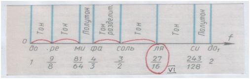 Её же можно получить, «воспользовавшись услугами» известной нам Vступени, квинты: умножить квинту 3/2 на тон 9/8. 3/2 х 9/8 = 27/16.