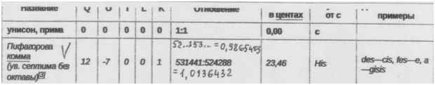 Кусочек таблицы пифагорова строя: