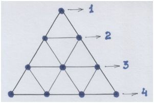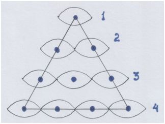 В равносторонний треугольник вписывается само число «10» в виде точек-«узелков», скрепляющих внутренние подобные малые треугольники: