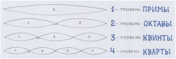 Он взял «первоатомы» мира – квинты/доминанты – как первозданную материю/Время. Сотворил из них что-то вроде отдельного существа – сущность – ОКТАВУ. Потом нашёл главные пропорции: отношение квинты и примы, октавы и квинты. Затем, используя найденные пропорции, стал делить крупные части сотворённой октавы на всё более мелкие. Так появились новые интервалы и звуки, их выражающие: терции и их отражения-перевёртыши сексты, секунды и их отражения-перевёртыши септимы.( О кварте же мы помним, что она – отражение-перевёртыш квинты.)