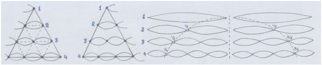 Попробуем совместить так, чтобы узлы совпадали. (У бегущих туда-обратно звуковых волн есть у з л ы и так называемые п у ч н о с т и. Об этом ты можешь узнать из книги проф. А.Г.Белявского «Теория звука в приложении к музыке»). Так нам треугольник покажет именно частоты или длины волн интервалов-консонансов в виде отношений/пропорций/дробей.