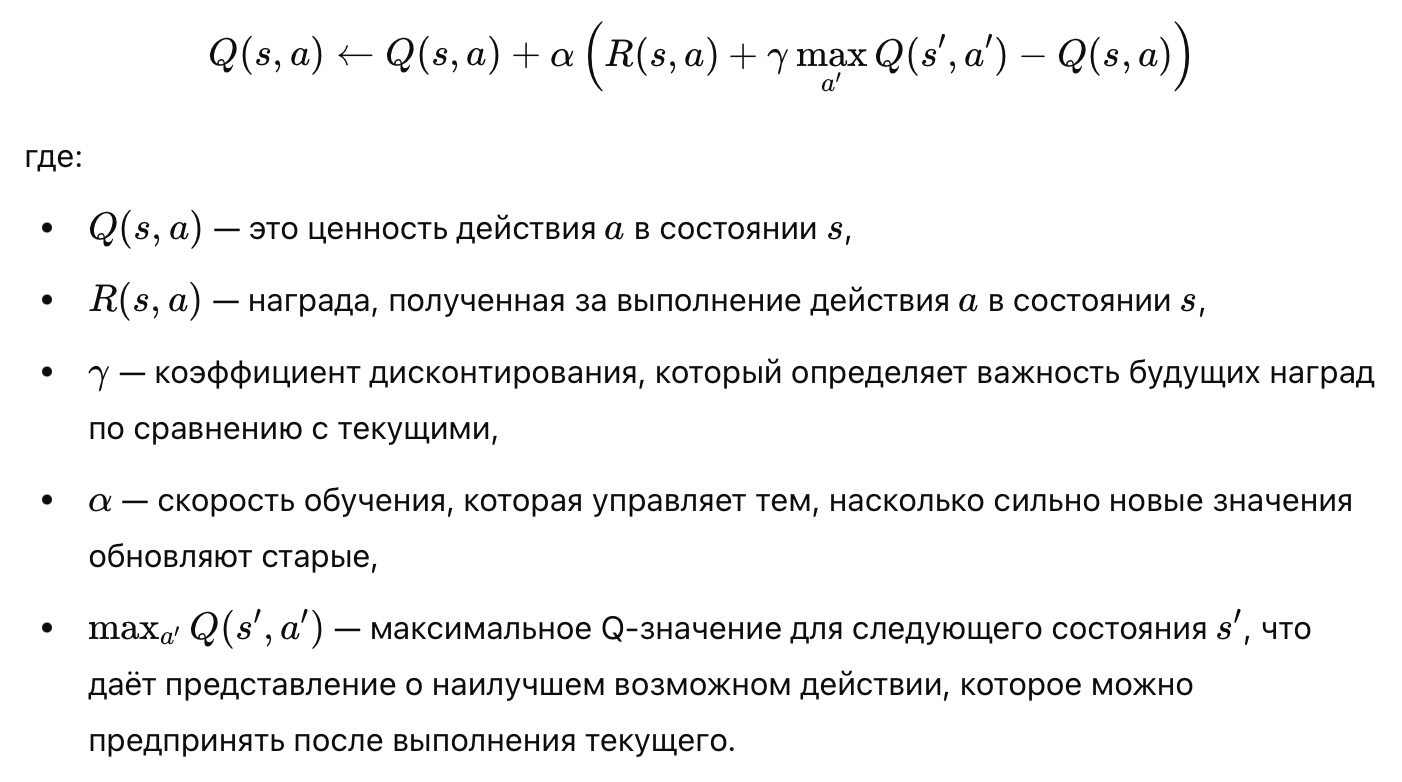 Q-learning использует так называемую Q-таблицу (или функцию), которая содержит оценку ценности (Q-значение) для каждого состояния и действия. Когда агент принимает какое-либо действие, он получает награду, которая используется для обновления значений в Q-таблице с использованием формулы:
