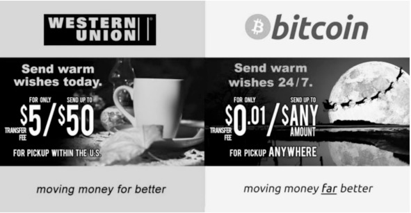 Мнение Армстронга было распространённым среди первых Биткойн-предпринимателей и вообще первых пользователей Биткойна. Я помню, как интернет-сообщество часто сравнивало Биткойн с Western Union, чтобы подчеркнуть его превосходство в качестве платёжной системы. В одной из самых популярных инфографик (на фото ниже) реклама Western Union была помещена рядом с аналогичной рекламой Биткойна. Реклама Western Union гласила: «Отправьте тёплые пожелания сегодня. Всего за 5 долларов вы можете отправить до 50 долларов с доставкой по США. „Перемещаем деньги к лучшему“». Реклама Биткойна гласила: «Отправляйте тёплые пожелания 24 часа в сутки 7 дней в неделю. Всего за 0,01 доллара вы можете отправить любую сумму и получить её в любой точке мира. „Перемещаем деньги гораздо лучше“».