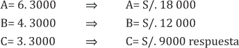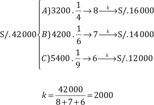 Un gerente desea repartir una gratificación de S/. 42 000 entre sus tres empleados en partes DP a sus sueldos (S/. 3200, S/. 4200 y S/. 5400) e IP a sus faltas (4, 6 y 9 días, respectivamente) ¿cuánto le corresponde a cada uno?