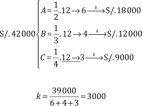 Observe que los números que representan las faltas de estos tres empleados se colocan invertidos (recuerde que el reparto es IP), luego si a cada uno de ellos se les multiplica por 12, la relación de proporcionalidad no se altera. Lo que se realiza a continuación es lo mismo que se ha descrito en el reparto anterior (reparto directo).