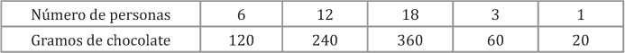 11. Margarita quiere hacer un postre de chocolate para su fiesta de cumpleaños. Para ello, consulta un libro de cocina y la receta indica que para 6 personas hay que utilizar 120 gramos de chocolate, ¿qué cantidad de chocolate tendrá que usar si a la fiesta van 12 personas?, ¿y si van 18?, ¿y para tres personas?