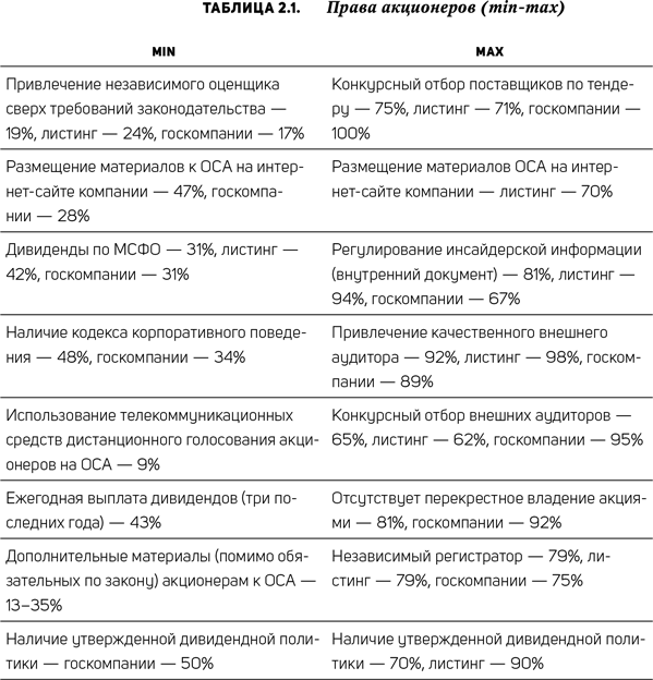 Данный компонент практики корпоративного управления в исследовании охватывает 21 рекомендацию CGBP. Сразу хочу предупредить, что мы не будем здесь анализировать все таблицы исследования, так как, повторюсь, изучение собственно рекомендаций CGBP не является нашей целью. Наша цель – попытка понять, почему компании так неравномерно внедряют рекомендации CGBP в свою практику. Для этого сгруппируем данные о внедрении рекомендаций CGBP в следующую таблицу min-max, собрав в раздел min те рекомендации, которые компании выполняют в минимальном процентном отношении (менее 50 %), а в раздел max – в максимальном (табл. 2.1).