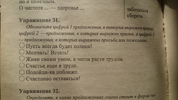 В частности, в приведённом упражнении по мнению составителей теста в предложении «Молчать! Встать!» выражен приказ. А в предложениях «Подойди-ка поближе» и «Счастливо оставаться!» – просьба или пожелание. Здесь, скорее, нужно иметь в виду, что если вы пишете художественное произведение, то для передачи вида побуждения нужно учитывать сложившиеся правила их передачи в тексте. Но главное, по моему мнению, это всё-таки контекст. В качестве примера можно привести самое известное побуждающее к путешествию предложение из трёх слов, одно из которых – матерное из трёх букв.