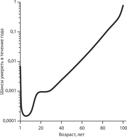 Рис. 5. Кривая Гомпертца. Вероятность смерти человека в каждом возрасте для США в 2003 году