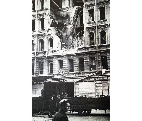В нашем районе такие фейерверки больших пожаров не наносили, зато крыша близко расположенного к нам «большого дома» сияла новогодними «бенгальскими» огнями и затухающими факелами от сбрасываемых на мостовую горящих бомб, что поднимало наше патриотическое настроение. На утро, идя в школу, можно было видеть результат ночной бомбёжки. Рухнувший от крыши до основания угол шестиэтажного дома, отрезанный от внутренних стен, на которых жутко смотрелись открытые в никуда двери комнат, висящие на стенах пальто, картины и фотографии, будто раскрытая для общего обозрения бывшая жизнь разных людей. Внизу беспорядочная гора балок, кирпичей, сломанных досок, домашних вещей.