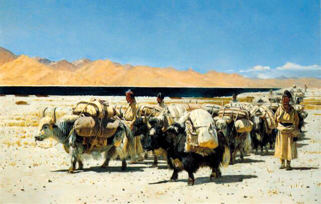 Караван яков, нагруженных солью, около озера Че-Морари на границе Западного Тибета