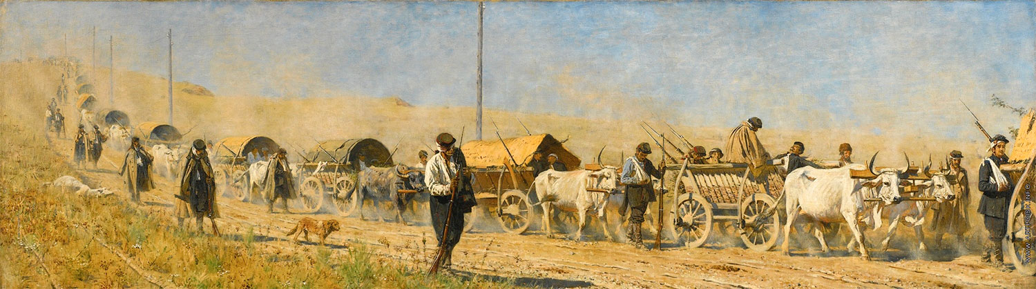 Тотчас за чертою города они увидели приближавшийся транспорт. Быки лениво переступали по песчаной дороге, поднимая, несмотря на раннее время дня, громадные столбы пыли, скрывавшие от глаз удалявшуюся линию повозок. Сегодня их было менее обыкновенного, может быть, потому, что главная масса раненых была уже провезена.