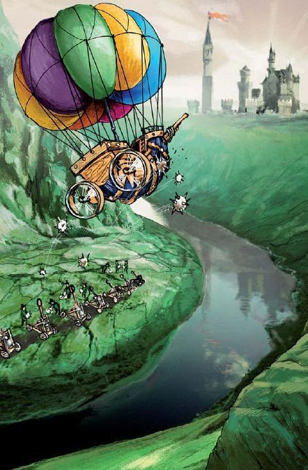 Карл Федорович бросился в рубку, начал переключать тумблеры и рычаги. Винты закрутились быстрее, и каравелла начала набирать ход. Кот и кролик, осторожно подойдя к краю, взглянули на остающихся сзади зеленых человечков. Последние, пущенные ими «ежики», падали вниз, не достигая своей цели. Кот посмотрел вперед и увидел, что еще немного, и они покинут изумрудные горы. Но в этот момент каменный «еж» просвистел мимо них и угодил прямо в шар, острым концом он впился в зеленую ткань, которая не выдержала и порвалась, начав выпускать воздух. Каменный «ежик» под напором воздуха, вырывающегося из зеленой секции, отлетел в сторону и понесся вниз. Одновременно с этим два других каменных «ежа» пролетели над шаром и начали свое падение вниз, оставив шар невредимым. Однако четвертый каменный «еж» вонзился в белую секцию шара и, порвав её, также отлетел вниз. При каждом попадании снизу доносились радостные крики маленьких зеленых человечков, следующая группа которых вела огонь из трех более мощных катапульт. Очередной каменный «еж» пролетел выше шара, чуть-чуть не задев его. Он его не задел только потому, что каравелла начала терять высоту из-за полученных повреждений. Увидев, что каравелла снижается, зеленые человечки радостно запрыгали и подбросили вверх свои большие зеленые шляпы. Только благодаря тому, что шар состоял из различных секций, независимых друг от друга каравелла не начала стремительное падение вниз и на разбилась об изумрудные горы. Она постепенно снижалась, а профессор старался сделать все возможное, чтобы это снижение было плавным, но удержать корабль на той же высоте он не мог. Высота гор уменьшалась, и это было спасительным для путешественников. За этими горами протекала широкая река, за которой возвышалась большая, еще более серьезная, черная гора, на которой расположилась крепость и замок.