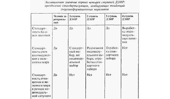Эволюционное значение четвертой ступени ДЭИР состоит в том, что она дает нам навыки, позволяющие полностью преодолеть зомбирующие тенденции социального уровня эволюционного развития человека и окунуться в следующий, над-социальный уровень. Обычный человек не видит этого надсоциального мира, потому что взаимодействует только с социальными закономерностями.