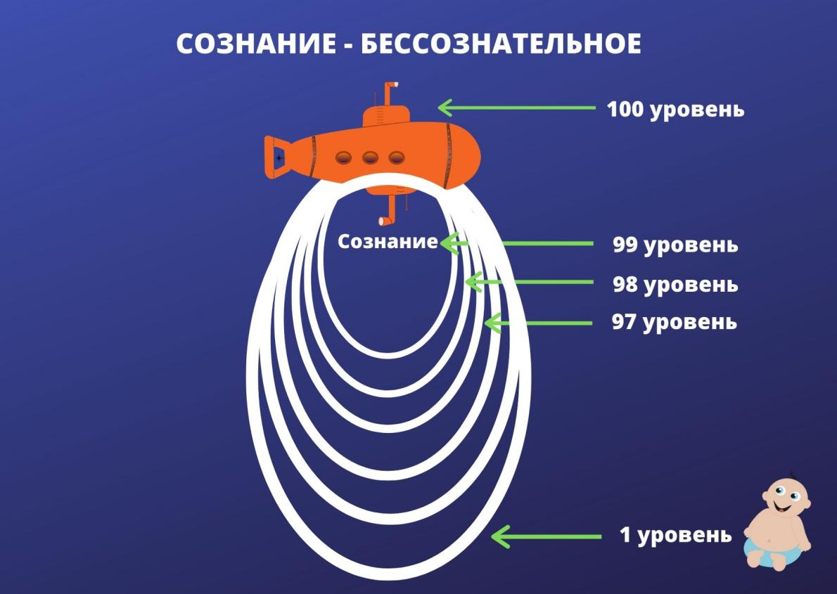 Усложним задачу: океан бессознательного вовсе не однороден и состоит из различных глубин (слоёв). Разделим его условно на 100 уровней. Тогда на сотом уровне будет располагаться поверхность океана, по которому движется наша подлодка с капитаном Сознание, девяносто девятый уровень – это граница бессознательного, и далее, от девяносто восьмого до первого уровня будут располагаться остальные слои нашего бессознательного.