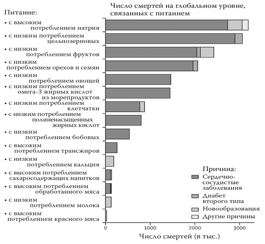 По данным мировой статистики (QR-код 74), 11 миллионов смертей в год (примерно 22 % в статистике смертности среди взрослых) связаны с неправильным питанием. Это значительно больше, чем даже от курения!