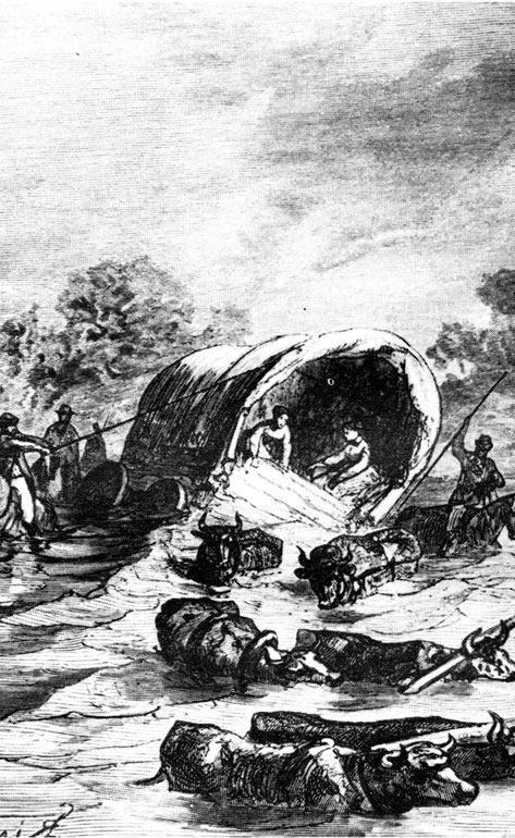 Все шло хорошо до середины Уиммеры. Но здесь дно стало опускаться и вода поднялась выше колес. Быки, отнесенные течением от брода, могли потерять дно под ногами и потянуть за собой качавшуюся повозку. Айртон отважно соскочил в воду и, схватив быков за рога, заставил их вернуться к броду.