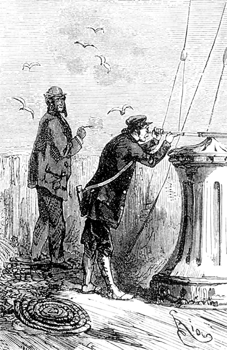 Когда загадочный незнакомец увидел, что все его попытки общения разбиваются о равнодушие майора, он схватил свою подзорную трубу – раздвинутая во всю длину, она достигала четырех футов – и, расставив ноги, неподвижный, как дорожный столб, направил ее на линию горизонта, где вода сливалась с небом. Понаблюдав так минут пять, он поставил свою подзорную трубу на палубу и оперся на нее, как на трость; но тут труба сложилась, части ее вошли одна в другую, и новый пассажир, внезапно потеряв точку опоры, едва не растянулся у грот-мачты.
