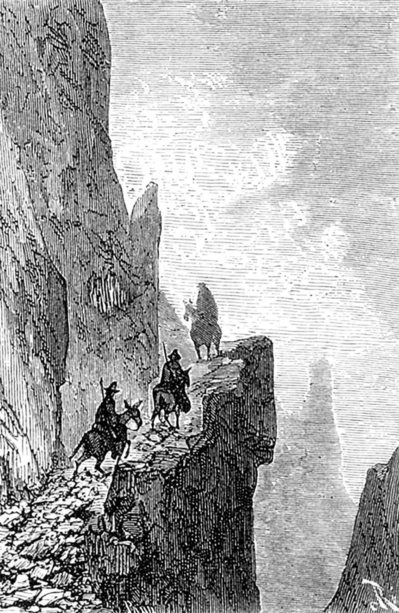 Начиная отсюда, дорога стала не только трудной, но даже и опасной. Подъемы сделались более крутыми, пропасти – угрожающе глубокими, тропинки по их краю становились все уже и уже. Мулы шли вперед осторожно, нагнув голову, обнюхивая дорогу. Ехали гуськом. Случалось, что на каком-нибудь крутом повороте мадрина вдруг исчезала из виду, и тогда маленький караван шел на отдаленное позвякивание ее колокольчика. Нередко извилистая тропа раздваивалась, отряд двигался по параллельным тропинкам, и катапац переговаривался со своими пеонами через непроходимую пропасть шириной всего в каких-нибудь двадцать футов, но глубиной в две тысячи.