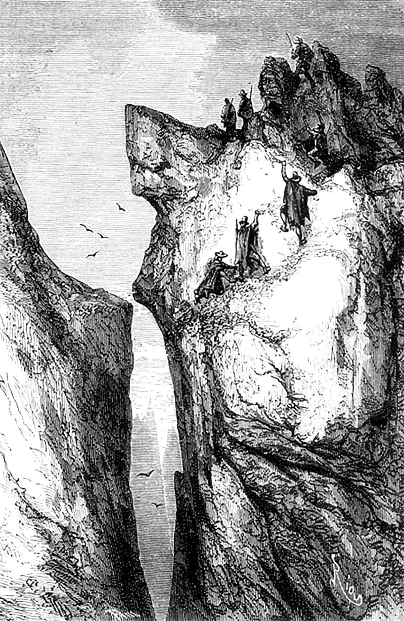 Путники достигли пояса кустарников. Когда они поднялись еще на двести пятьдесят туазов69, кустарники сменились злаками и кактусами. На высоте же одиннадцати тысяч футов исчезли и они. На бесплодной почве уже не видно было никакой растительности. За все время подъема путешественники сделали лишь один привал, в восемь часов утра. Быстро передохнув и кое-как подкрепившись, они, превозмогая усталость, отважно возобновили подъем, пренебрегая все возраставшими опасностями. Им приходилось перелезать через остроконечные гребни, пробираться над пропастями, куда даже заглянуть было страшно. Во многих местах попадались деревянные кресты, указывавшие места прошлых катастроф. Около двух часов пополудни между оголенными остроконечными вершинами развернулось огромное, без всяких следов растительности плоскогорье, похожее на пустыню. Воздух здесь был сухой, а небо ярко-голубого цвета. На этой высоте дождей не бывает: испарения здесь превращаются в снег или град. Повсюду, словно кости скелета, торчали из – под белого покрова остроконечные порфировые и базальтовые вершины. Иногда обваливались куски разрушавшегося от выветривания кварца или гнейса; разреженный воздух почти заглушал тупой звук их падения.