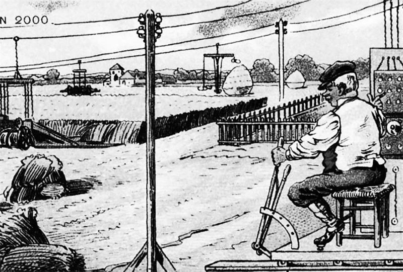 Ко Всемирной выставке в Париже в 1900 году выпустили цветные почтовые карточки «Мир будущего», изображавшие мир через 100 лет, в 2000 году. На этой карточке – уборка урожая машинами.
