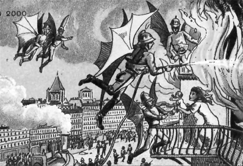 Карточка из серии «Мир будущего»: летающие пожарные. Летать то пожарные летают, а топят в 2000 году, стало быть, дровами и углем. И по улице идет явно паровая машина.