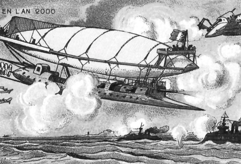 Карточка из серии «Мир будущего»: воздушный бой. Для 2000 года картинка безнадежно устарела, но выпустили ее за 15 лет до того, как Лондон бомбили немецкие цепеллины.