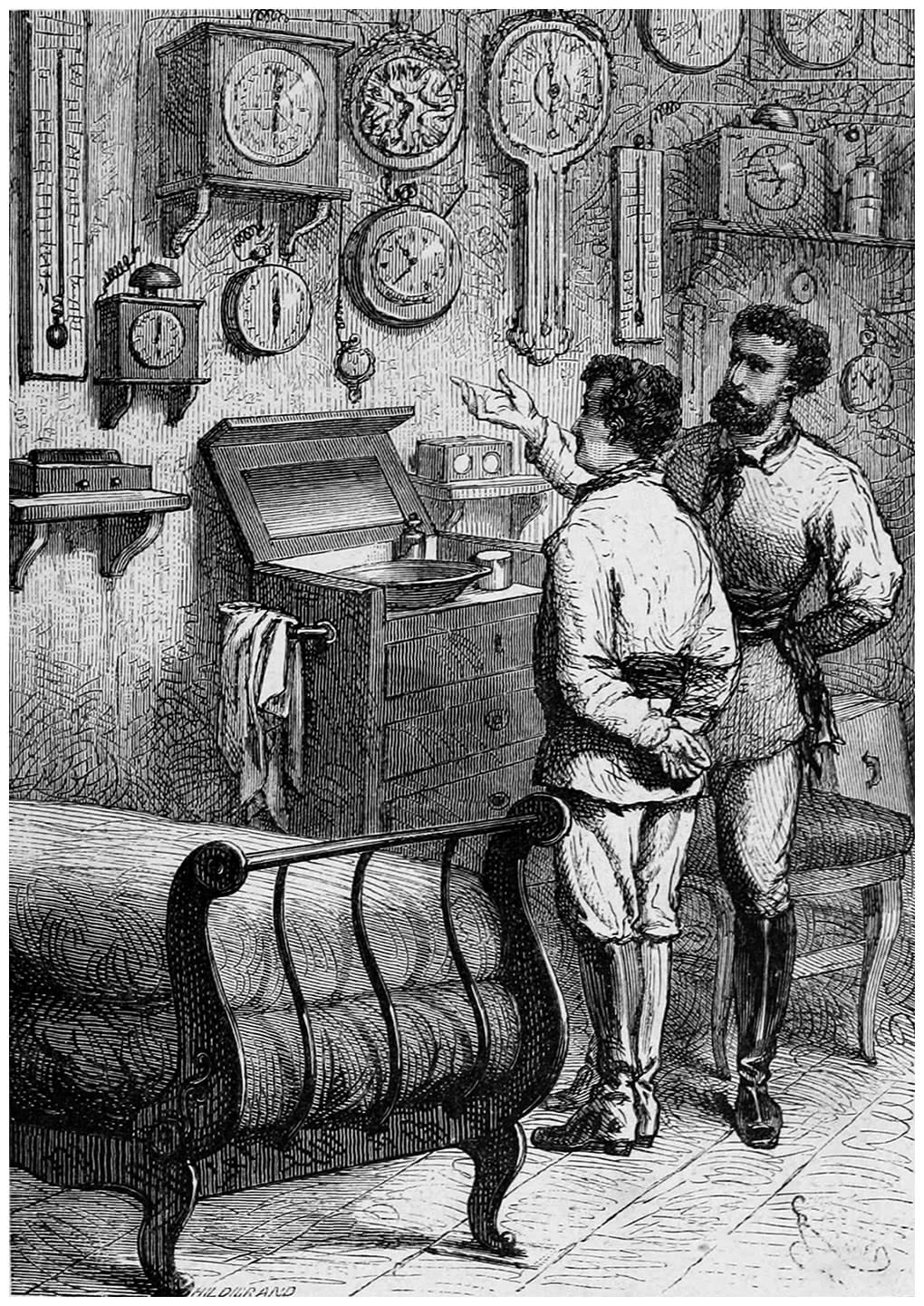 – Не уверен, что у них это получится, – холодно заметил капитан Немо. – Итак, вы уже знаете, для чего в первую очередь применяется эта сила. Именно она обеспечивает нас освещением – равномерным и непрерывным, в отличие от солнечного света. Теперь взгляните на эти стенные часы: они тоже электрические, причем точностью хода превосходят лучшие хронометры. Я нанес на циферблат двадцать четыре деления, как у итальянских часов, потому что для меня не существует ни ночи, ни дня, ни солнца, ни луны, – лишь этот искусственный свет, который я уношу с собой в морские глубины! Сейчас, к примеру, десять часов утра, видите?