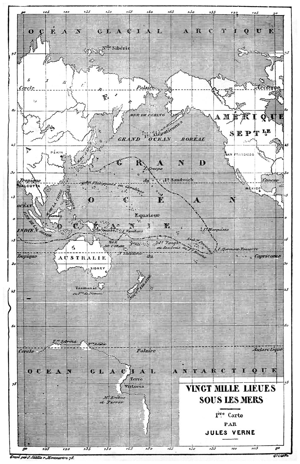 Через точку, которую я отметил пальцем, проходило течение Куросио, что в переводе с японского означает «черная река». Оно берет начало в Бенгальском заливе, где нагревается под отвесными лучами тропического солнца, затем пересекает Малаккский пролив, огибает побережье Азии и доходит до Алеутских островов на севере Тихого океана, мимоходом подхватывая и увлекая за собой стволы камфорных деревьев и другие образцы местной фауны; его теплый поток цвета индиго резко выделяется на сером фоне холодных океанских волн. Именно по этому течению нам и предстояло плыть. Я прослеживал путь Куросио, представляя, как оно теряется на бескрайних тихоокеанских просторах, когда на пороге салона появились Нед с Конселем.