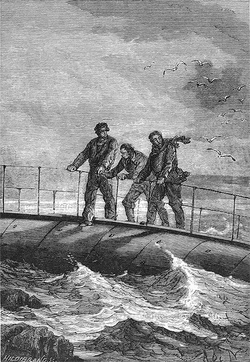 Воспользовавшись случаем, мы с Недом Лендом и Консейлем вышли на палубу, которая, как всегда, была пуста, и встали за штурвальной рубкой. Мне показалось, что сам капитан Немо лично управляет «Наутилусом».