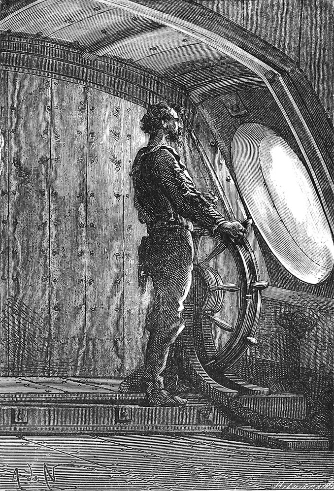Рубка имела форму квадрата со стороной шесть футов и несколько напоминала рубки на пароходах, ходивших по Миссисипи и Гудзону. Посередине стоял штурвал, соединенный штуртросами с рулем управления, они шли до самой кормы «Наутилуса». Четыре иллюминатора в перегородках рубки давали рулевому возможность смотреть на все четыре стороны.