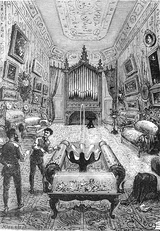 В специальном отделении блестели при электрическом освещении розовые жемчужины, извлеченные из пинн Красного моря. Рядом лежал зеленый, желтый, голубой и черный жемчуг – удивительные продукты различных моллюсков всех морей и океанов. Здесь было несколько бесценных образцов из самых редких жемчужниц. Некоторые жемчужины были больше голубиного яйца, каждая из них стоила гораздо дороже той, которую путешественник Тавернье продал за три миллиона персидскому шаху. Красотой они превосходили даже жемчуг маскатского имама, которому, как я думал, не было равных. Одним словом, цена этого собрания была неопределима. Капитан Немо должен был истратить миллионы, чтобы приобрести эти драгоценные образцы, и я мысленно спрашивал себя, из каких источников он мог удовлетворять свои фантазии, собирая подобные коллекции, как вдруг мои размышления были прерваны следующими словами: