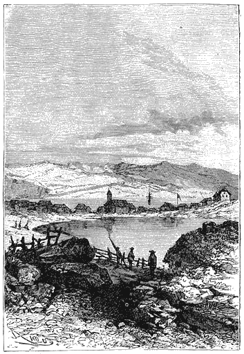 Город раскинулся вдоль низкой и довольно болотистой лощины. С одной стороны он огражден хаотическими наслоениями застывшей лавы, отлогими уступами постепенно нисходящими к морю. С другой – простирается обширный, ограниченный на севере большим глетчером Снайфедльс, залив Факсафлоуи, в котором в ту пору «Валькирия» была единственным судном, стоявшим на якоре. Обычно на рейде стоят во множестве английские и французские рыбачьи суда, но в то время они находились на восточном берегу острова.
