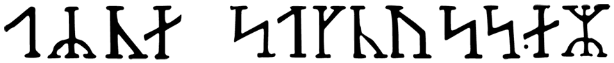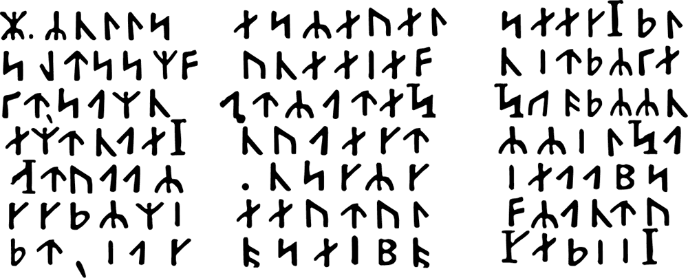 Дядюшка поднял повыше очки, взял сильную лупу и тщательно просмотрел первые страницы книги. На обороте второй страницы он открыл что-то вроде пятна, похожего на чернильную кляксу; но, вглядевшись попристальнее, можно было различить несколько наполовину стертых знаков. Дядя понял, что именно на это место надо обратить наибольшее внимание; он принялся чрезвычайно старательно рассматривать его и разглядел, наконец, с помощью своей лупы следующие рунические письмена, которые смог прочесть без затруднения: