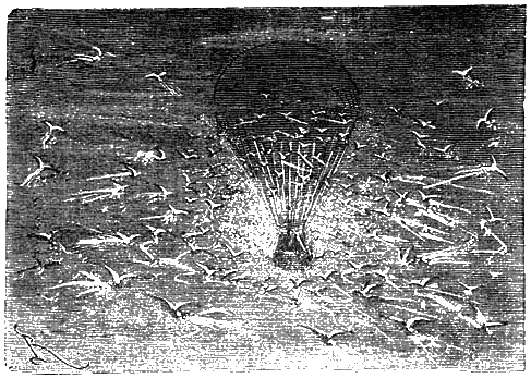 Тысячи голубей, к хвостам которых прикрепили горящее вещество, были пущены на «Викторию». Перепуганные птицы разлетелись, описывая в воздухе огненные зигзаги. Кеннеди стал палить из всех имеющихся ружей в огненную стаю, но что мог он поделать против бесчисленного множества врагов! Голуби уже кружились вокруг «Виктории», и шар, отражая огни, сам казался заключенным в огненную сетку.