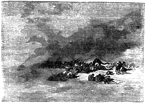 В тот момент, когда доктор говорил это с отчаянием и даже яростью, он вдруг увидел на севере, как вздымаются облаками пыли пески пустыни, кружимые противоположными воздушными течениями. Очевидно, там свирепствовал смерч. И в нем, разбросанный, опрокинутый, заносимый песками, погибал караван. Глухо и жалобно стонали валявшиеся на земле верблюды. Из удушливого тумана неслись крики и вопли людей. Кое-где среди хаоса пестрела яркая одежда. И над всей этой картиной разрушения ревел и завывал чудовищный вихрь…