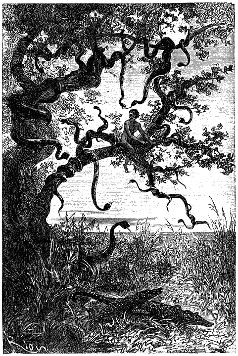 Как всегда в экваториальных странах, день наступил сразу; Джо бросил взгляд на дерево, служившее ему убежищем ночью. Ему представилось такое неожиданное зрелище, что он остолбенел. Ветви дерева, где он провел ночь, были буквально унизаны змеями и хамелеонами. Из-за них почти не видно было листвы. Можно было подумать, что это дерево новой породы, на котором произрастают пресмыкающиеся. Под первыми лучами солнца все это принялось ползать и извиваться. Ужас, смешанный с отвращением, охватил Джо, и он мигом спрыгнул на землю.