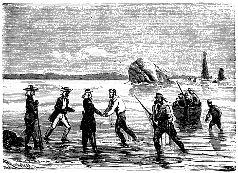 Там стояло человек десять, одетых во французскую военную форму, – удивленных, восхищенных, испуганных. Можно представить себе, до чего их ошеломило появление «Виктории», поднимавшейся с того берега. Они были недалеки от того, чтобы увидеть в этом спускавшемся с небес шаре чудо. Но их начальники, лейтенант морской пехоты и мичман, знали из европейских газет о смелой экспедиции доктора Фергюссона и сейчас же поняли, что происходит.