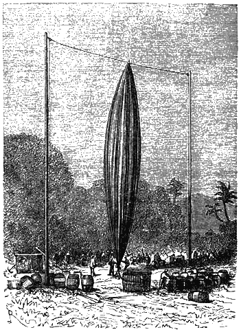 Наполнение оболочек газом началось около трех часов утра и длилось почти восемь часов. За час до полудня воздушный шар, одетый в сетку, грациозно покачивался над своей корзиной, удерживаемый большим количеством мешков с землей. С особой тщательностью был установлен аппарат для расширения газа и прилажены в цилиндрическом ящике нагрева трубки, сообщающиеся с обеими оболочками.