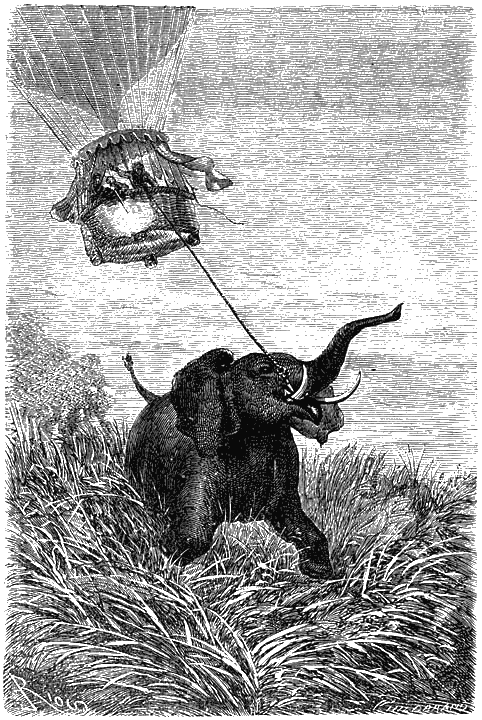 Слон подвигался вперед довольно быстро; вскоре он добрался до лужайки, где его можно было рассмотреть. По его гигантскому росту доктор признал в нем самца прекрасной породы. Его беловатые клыки, удивительно красиво изогнутые, были не меньше восьми футов в длину. Между этими-то клыками и засели крепко-накрепко якорные лапы.
