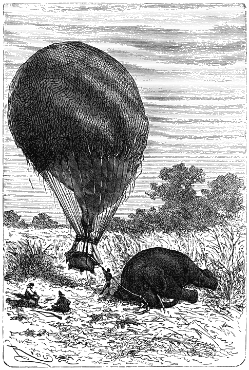 Положение становилось совершенно критическим: канат якоря, накрепко привязанный к корзине, нельзя было ни отвязать, ни перерезать ножами, а «Виктория» была почти у леса. Вдруг в тот момент, когда слон задрал голову, в глаз ему попала пуля. Он остановился, зашатался, колени его подогнулись, и он подставил охотнику свой бок.
