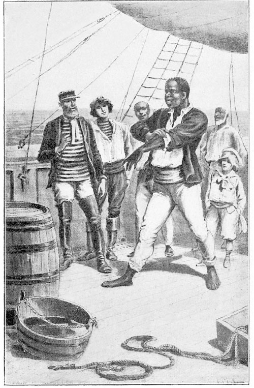 Негоро не растерялся от неожиданного нападения. Он быстро прислонился спиной к мачте и поднял над головой первое попавшееся ему в руки оружие, оказавшееся одним из запасных гарпунов, оставленных охотниками за ненадобностью.