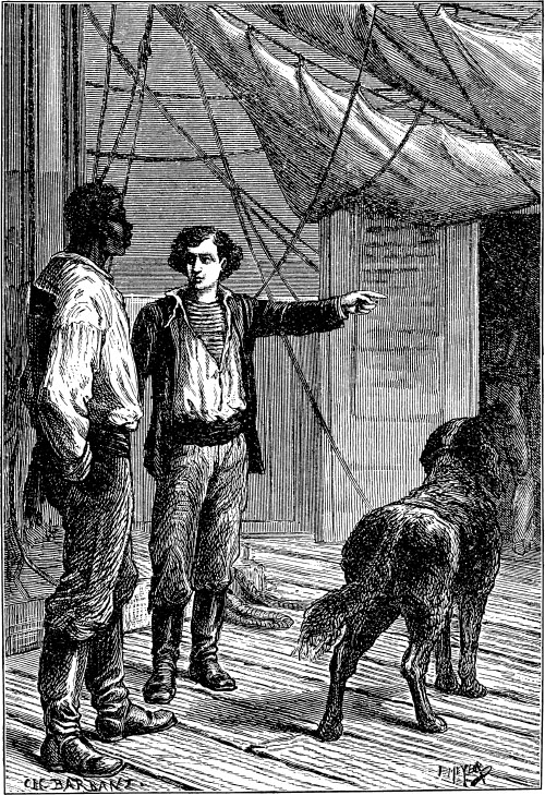 – Сюда, Динго! – повелительно крикнул Дик Сэнд с капитанского мостика. В то же самое время миссис Уэлдон успела подбежать и схватить собаку за ее широкий ошейник. Совместное воздействие обоих любимых голосов несколько успокоило Динго, который повиновался призыву и, хотя и с видимой неохотой, тихо рыча, улегся у ног своей хозяйки.