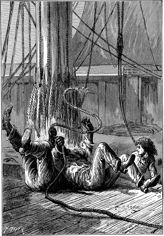 Дик Сэнд поспешил ободрить растерявшихся новичков-матросов и объяснить ребенку, что научиться морскому делу не так легко и что смеяться над чужой неудачей нехорошо и невеликодушно. Мальчик серьезно согласился с ним и принялся просить прощения у своих добрых черных друзей, обещая учиться тянуть веревки вместе с ними. Затем Дик Сэнд показал своим волонтерам, как делать знаменитые морские узлы, не развязывающиеся ни при каких обстоятельствах, и первая часть «парусного учения» окончилась.