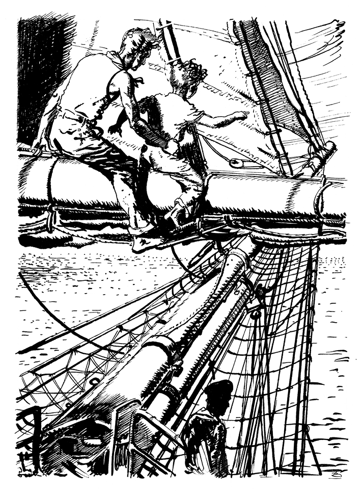 Дик Сэнд объяснял Джеку, почему правильно нагруженный «Пилигрим» не может опрокинуться, хотя он и кренится довольно сильно на штирборт[10], как вдруг мальчик прервал его восклицанием: