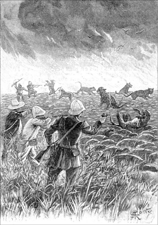 Вот от них-то и отбивались пистолетными и ружейными выстрелами два человека. Им уже удалось убить нескольких хищников, но они с трудом удерживали равновесие, перескакивая с одного панциря на другой, в то время как четвероногие явно не испытывали ни малейшего неудобства.