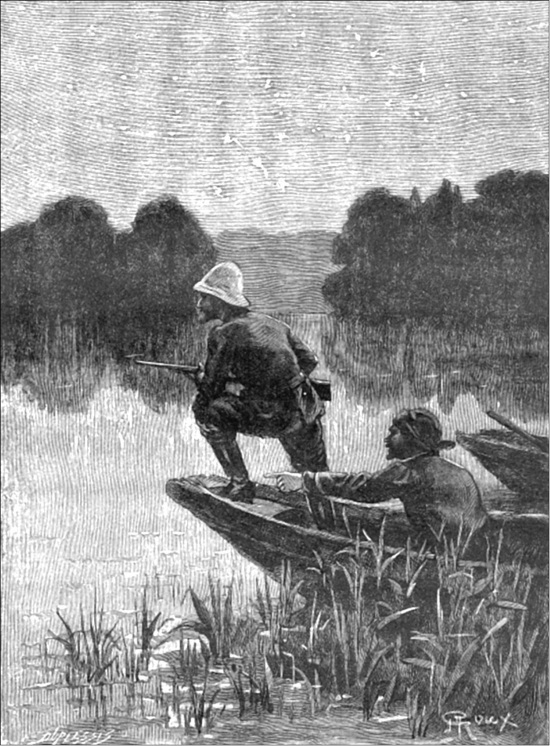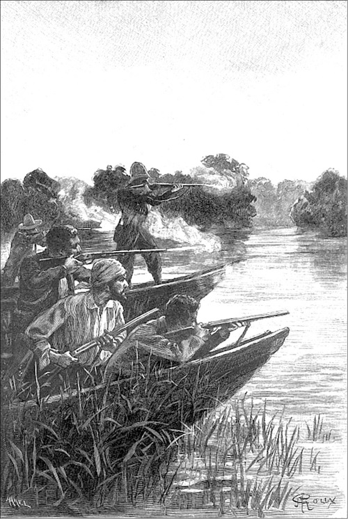 Было пять часов утра и едва начинало светать, когда до слуха только что проснувшихся молодых людей донесся плеск весел. Пробравшись на корму своей пироги, они увидели, что нападение неизбежно, и выстрелили по куриарам.