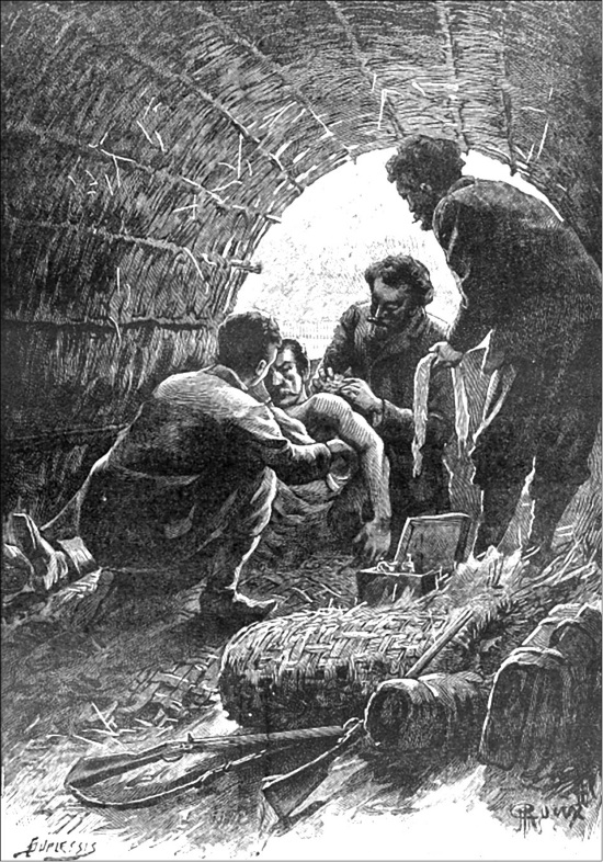 Итак, Жермен Патерн занялся раной сержанта, а Жак Эллок поспешил прийти ему на помощь. Осмотрев рану, Жермен убедился, что стрела вошла в плечо на три сантиметра, но задела только мягкие ткани, не повредив ни мускулов, ни нервов. А следовательно, можно было не опасаться осложнений, если, конечно, стрела не была отравлена.