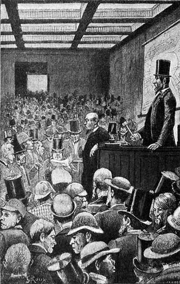 По мере того как приближался назначенный час, толпа всё прибывала, и за три часа до открытия аукциона Болтон-стрит был уже настолько запружен публикой, что, казалось, не было никакой возможности пробраться к зданию аукционного зала. А когда двери его распахнулись, то вмиг всё пространство, отведенное публики, переполнилось до такой степени, что негде было упасть яблоку. Осталось незанятым только одно небольшое отгороженное место для делегатов.